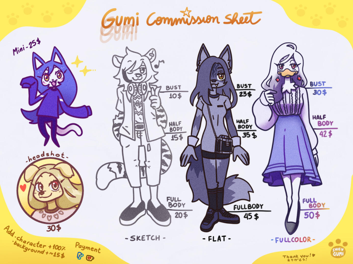 - Payment upfront only via Paypal or Ko-Fi- My comms are often artistic freedom, it's just easier on me! Keep this in mind when commissioning me.- Art may take a few hours to a few days depending on the complexity of your order and the queue.- If the art contains an error in your character, I will correct it. Depending on the number of corrections/alterations, a tax will be charged.- I have a no refund policy, after you send payment I will not refund unless I offer.- You may not use my art for commercial use unless you ask and pay the fee. Do not claim my art as your own. You may use my art for personal use or nonprofit use! Credit for the art is appreciated a lot!By commissioning me you accept my termsIf you have any other questions please ask! (DM me on my socials)Thank you for reading!
